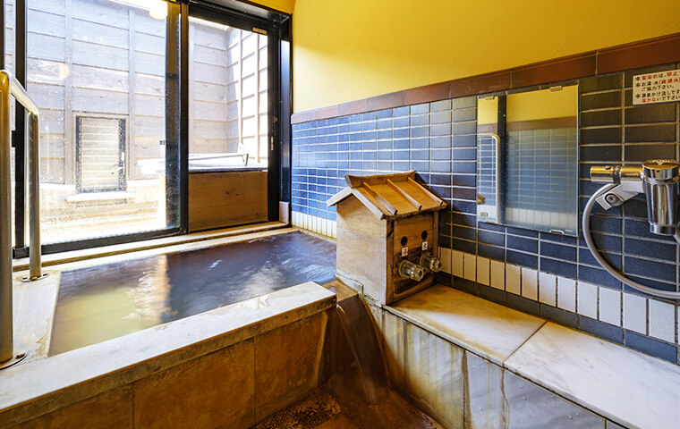 サウナの他にも、半露天の雰囲気を味わえる内風呂や源泉掛け流しの露天風呂も用意。